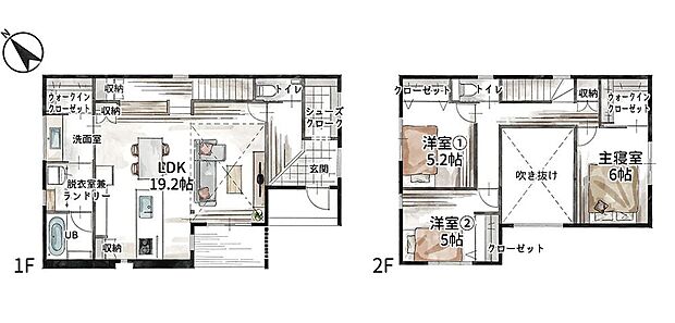 • 【LDK】明るく開放的な吹き抜けリビングは、2階の廊下からも見下ろすことができます。