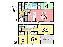 | 間取り | 3LDK(インナーバルコニー) 間取り内訳:リビングダイニングキッチン 17.7帖(1階)・洋室 8.5帖(2階)・洋室 5.7帖(2階)・洋室 5.3帖(2階) |