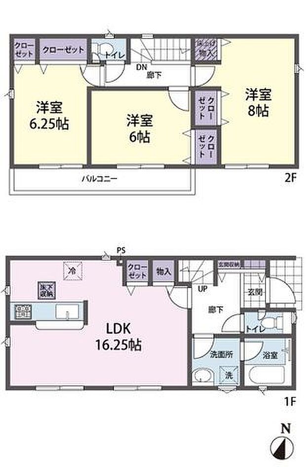 | 間取り | 3LDK 間取り内訳:リビングダイニングキッチン 16.2帖(1階)・洋室 8帖(2階)・洋室 6.2帖(2階)・洋室 6帖(2階) |