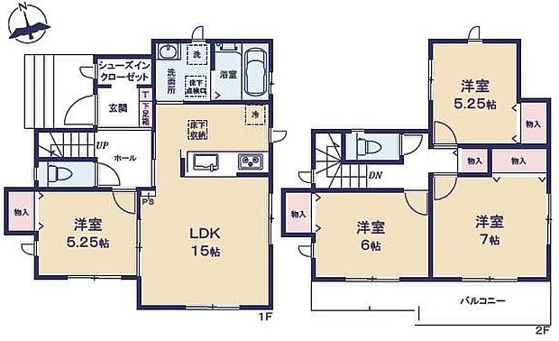 | 間取り | 4LDK 間取り内訳:リビングダイニングキッチン 15帖(1階)・洋室 5.2帖(1階)・洋室 6帖(2階)・洋室 7帖(2階)・洋室 5.2帖(2階) |