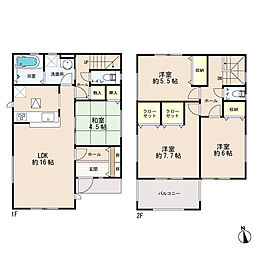 | 間取り | 4LDK 間取り内訳:リビングダイニングキッチン 23.5帖(1階)・洋室 6.1帖(1階)・洋室 7.4帖(2階)・洋室 5.4帖(2階)x2 |