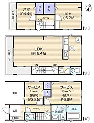 | 間取り | 2SLDK 間取り内訳:収納 5帖(1階)・収納 4.5帖(1階)・リビングダイニングキッチン 16.7帖(2階)・洋室 6帖(3階)x2 |