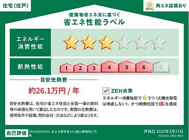 星マークの数が多いほどエネルギー消費性能が高いことを示しています。再エネ設備のない住宅は★0~★4の5段階評価、再エネ設備がある住宅は★0~★6の7段階評価となります。