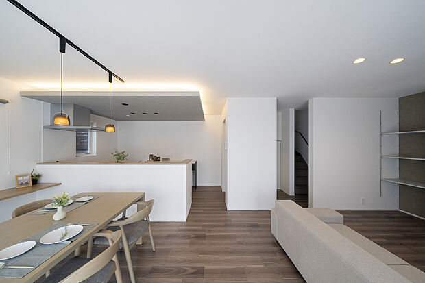 • 【キッチン】キッチン上部は折り下げ天井で、空間を緩やかに仕切ります。間接照明を入れて柔らかな雰囲気に。