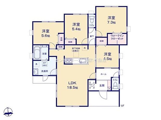 | 間取り | 4LDK 間取り内訳:リビングダイニングキッチン 18.5帖(1階)・洋室 7.3帖(1階)・洋室 5.6帖(1階)・洋室 5.4帖(1階)・洋室 4.5帖(1階) |