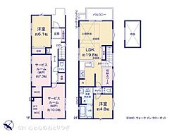 間取り内訳:洋室 6.1帖(1階)・収納 10帖(1階)・収納 7.3帖(1階)・リビングダイニングキッチン 19.8帖(2階)・洋室 4.8帖(2階)