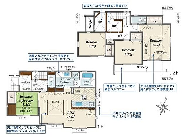 | 間取り | 4LDK 間取り内訳:リビングダイニングキッチン 16帖(1階)・和室 5.2畳(1階)・洋室 5.2帖(2階)・洋室 5.2帖(2階)・洋室 7.8帖(2階) |