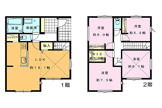間取り内訳:リビングダイニングキッチン 18.1帖(1階)・洋室 7.5帖(2階)・洋室 6.1帖(2階)・洋室 6帖(2階)・洋室 5.2帖(2階)