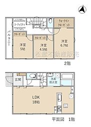 | 間取り | 3LDK 間取り内訳:リビングダイニングキッチン 18帖(1階)・洋室 6.7帖(2階)・洋室 5帖(2階)・洋室 4.5帖(2階)x2・洋室 4.5帖(2階) |