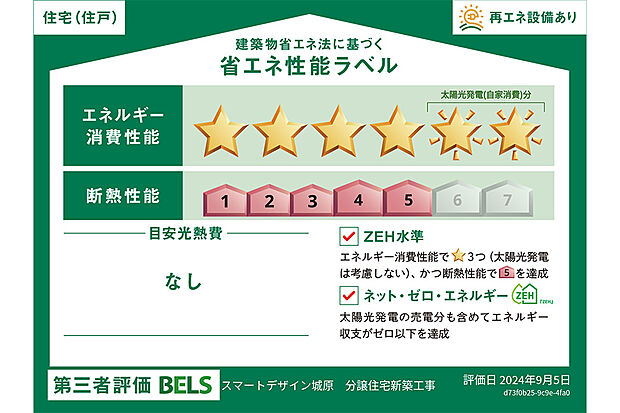 - 星マークの数が多いほどエネルギー消費性能が高いことを示しています。再エネ設備のない住宅は★0~★4の5段階評価、再エネ設備がある住宅は★0~★6の7段階評価となります。