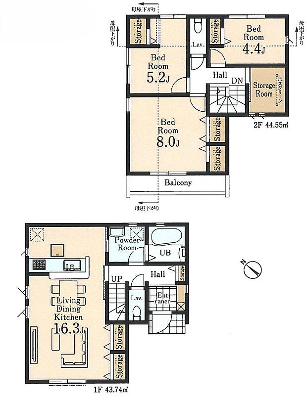 | 間取り | 3LDK 間取り内訳:リビングダイニングキッチン 16.3帖(1階)・洋室 5.2帖(2階)・洋室 4.4帖(2階)・洋室 8帖(2階) |