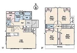 | 間取り | 3SLDK 間取り内訳:リビングダイニングキッチン 17.7帖(1階)・収納 1.1帖(1階)・洋室 6帖(2階)・洋室 4.6帖(2階)・洋室 4.5帖(2階) |