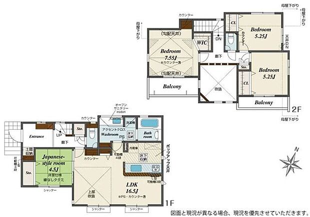 | 間取り | 4LDK 間取り内訳:リビングダイニングキッチン 16.5帖(1階)・洋室 7.5帖(2階)・洋室 5.2帖(2階)・洋室 5.2帖(2階)・和室 4.5畳(1階) |