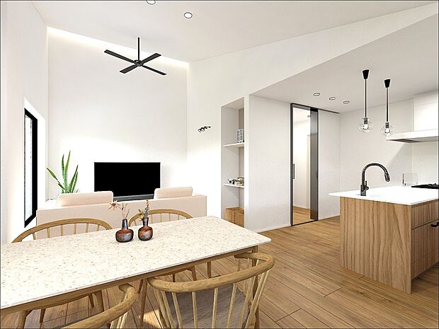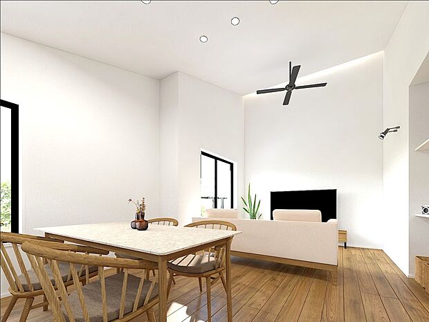 開放感溢れる勾配天井のLDKは広々19帖以上 水廻りが回遊動線の間取りで家事の時短に繋がります。