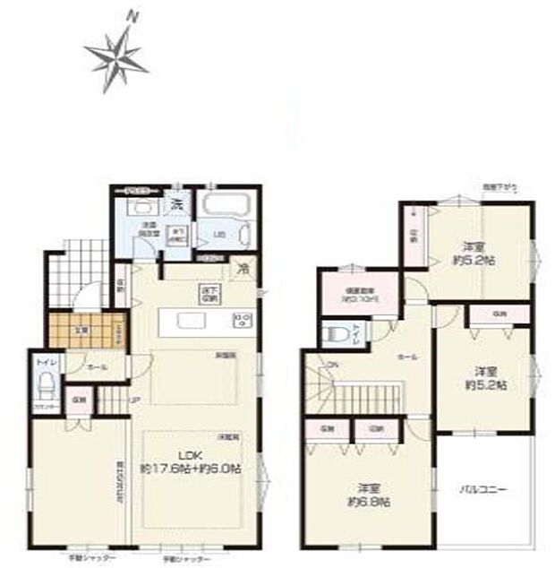 | 間取り | 3LDK 間取り内訳:リビングダイニングキッチン 23.6帖(1階)・洋室 6.8帖(2階)・洋室 5.2帖(2階)・洋室 5.2帖(2階) |