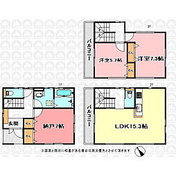 | 間取り | 2SLDK 間取り内訳:リビングダイニングキッチン 15.3帖・収納 7帖・洋室 5.7帖・洋室 7.3帖 |