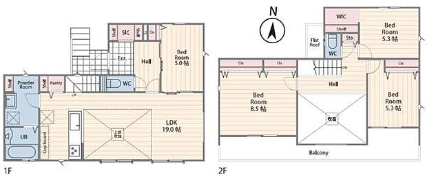 | 間取り | 4LDK 間取り内訳:リビングダイニングキッチン 19帖(1階)・洋室 5帖(1階)・洋室 8.5帖(2階)・洋室 5.3帖(2階)・洋室 5.3帖(2階) |