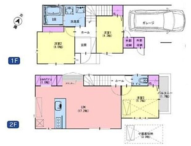 | 間取り | 3LDK 間取り内訳:洋室 6帖(1階)・洋室 4.3帖(1階)・リビングダイニングキッチン 17.2帖(2階)・洋室 5.2帖(2階) |