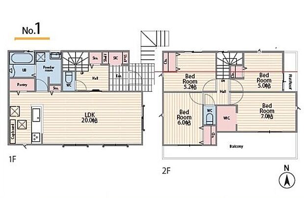 | 間取り | 4LDK 間取り内訳:リビングダイニングキッチン 20帖(1階)・洋室 7帖(2階)・洋室 6帖(2階)・洋室 5.2帖(2階)・洋室 5帖(2階) |