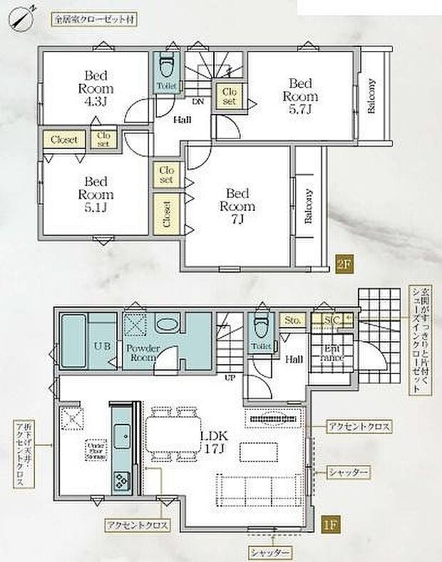 間取り内訳:リビングダイニングキッチン 17帖(1階)・洋室 4.3帖(2階)・洋室 5.7帖(2階)・洋室 5.1帖(2階)・洋室 7帖(2階)