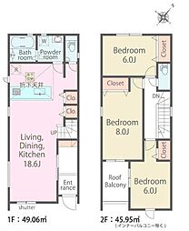 | 間取り | 3LDK 間取り内訳:リビングダイニングキッチン 17帖(1階)・洋室 8帖(2階)・洋室 5.3帖(2階)・洋室 5.2帖(2階) |