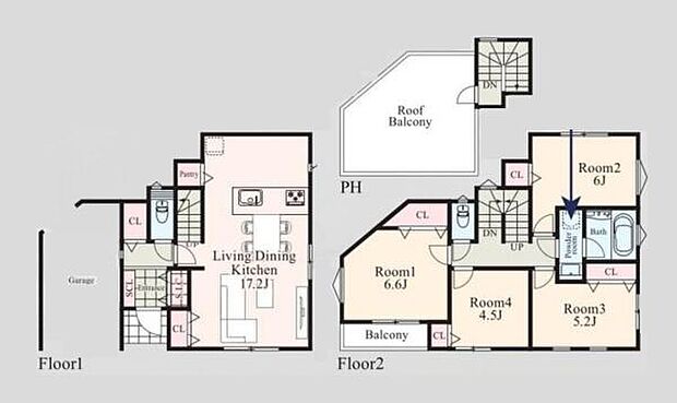 間取り内訳:リビングダイニングキッチン 17.2帖(1階)・洋室 6.6帖(2階)・洋室 6帖(2階)・洋室 5.2帖(3階)・洋室 4.5帖(3階)
