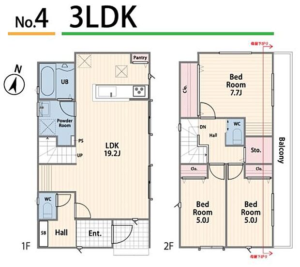 | 間取り | 3LDK 間取り内訳:リビングダイニングキッチン 19.2帖(1階)・洋室 7.7帖(2階)・洋室 5帖(2階)・洋室 5帖(2階) |