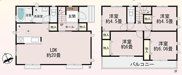 | 間取り | 4LDK 間取り内訳:リビングダイニングキッチン 20帖(1階)・洋室 6帖(2階)・洋室 6帖(2階)・洋室 4.5帖(2階)・洋室 4.5帖(2階) |