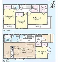 間取り内訳:リビングダイニングキッチン 17.2帖(1階)・洋室 7.5帖(2階)・洋室 6帖(2階)・洋室 5.7帖(2階)
