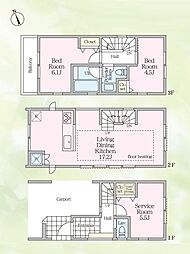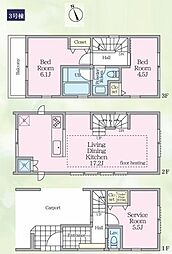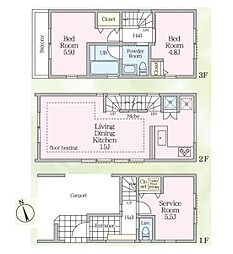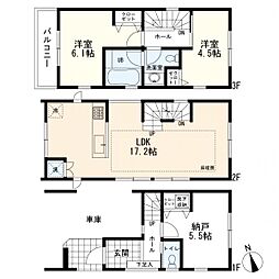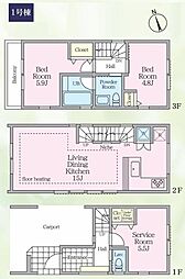 | 間取り | 2SLDK 間取り内訳:収納 5.5帖(1階)・リビングダイニングキッチン 15.5帖(2階)・洋室 6帖(3階)・洋室 4.4帖(3階)・収納 4.5帖(3階) |