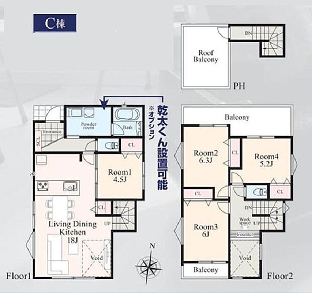 間取り内訳:リビングダイニングキッチン 18帖(1階)・洋室 4.5帖(1階)・洋室 6.3帖(2階)・洋室 6帖(2階)・洋室 5.2帖(2階)