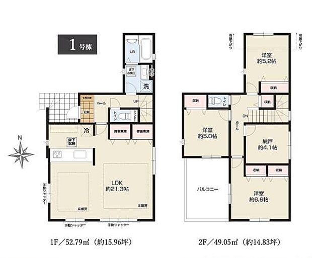 | 間取り | 3SLDK 間取り内訳:洋室 5帖(2階)・洋室 5.2帖(2階)・収納 4.1帖(2階)・リビングダイニングキッチン 21.3帖(1階)・洋室 6.6帖(2階) |