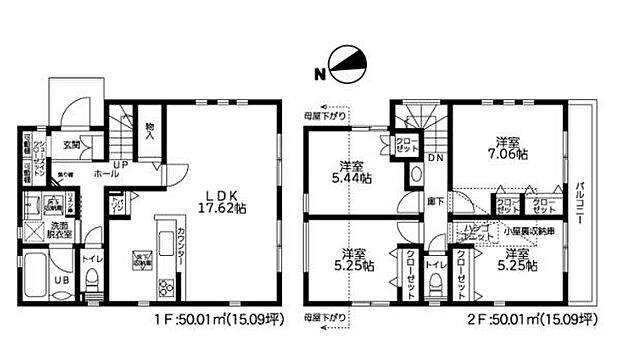 | 間取り | 4LDK 間取り内訳:リビングダイニングキッチン 17.6帖(1階)・洋室 7帖(2階)・洋室 5.4帖(2階)・洋室 5.2帖(2階)・洋室 5.2帖(2階) |