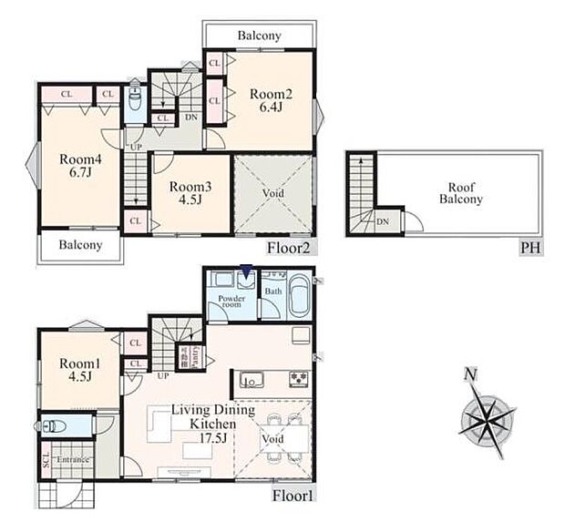 | 間取り | 4LDK 間取り内訳:リビングダイニングキッチン 17.5帖(1階)・洋室 4.5帖(1階)・洋室 6.7帖(2階)・洋室 6.4帖(2階)・洋室 4.5帖(2階) |