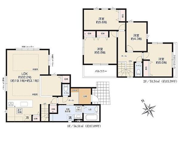 間取り内訳:リビングダイニングキッチン 22.2帖(1階)・洋室 6.8帖(2階)・洋室 6帖(2階)・洋室 5.6帖(2階)・洋室 4.3帖(2階)