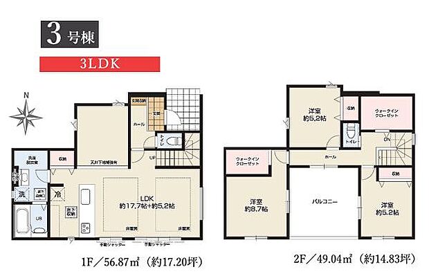 | 間取り | 3LDK 間取り内訳:リビングダイニングキッチン 22.9帖(1階)・洋室 8.7帖(2階)・洋室 5.2帖(2階)・洋室 5.2帖(2階) |