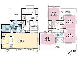 間取り内訳:リビングダイニングキッチン 18.2帖(1階)・洋室 11.2帖(2階)・洋室 5.2帖(2階)・洋室 5.2帖(2階)