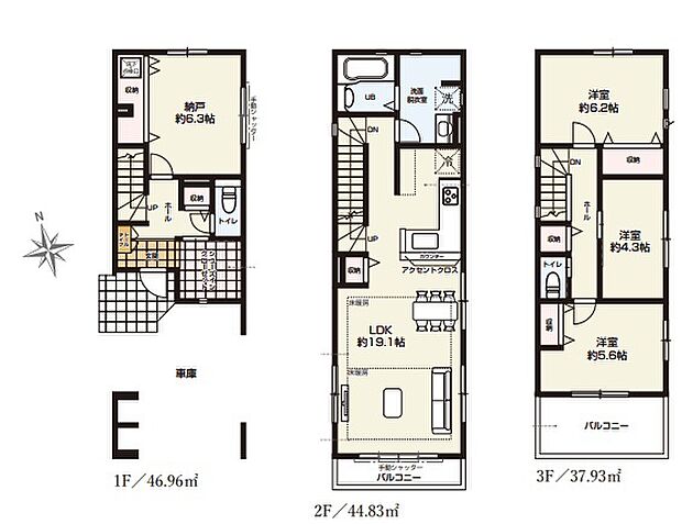 間取り内訳:リビングダイニングキッチン 19.1帖・洋室 6.2帖・洋室 5.6帖・洋室 4.3帖・収納 6.3帖