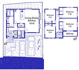 間取り内訳:リビングダイニングキッチン 19.8帖(1階)・洋室 6.6帖(2階)・洋室 6.5帖(1階)・洋室 6帖(2階)・洋室 4.5帖(2階)