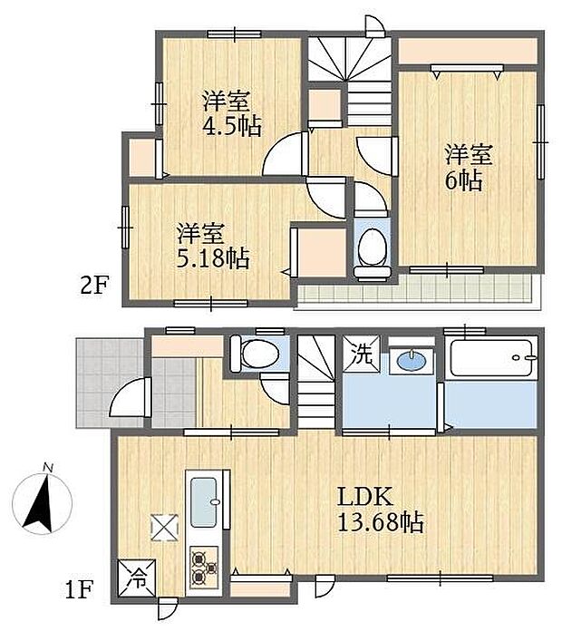 | 間取り | 3LDK 間取り内訳:リビングダイニングキッチン 13.6帖(1階)・洋室 4.5帖(2階)・洋室 5.1帖(2階)・洋室 6帖(2階) |