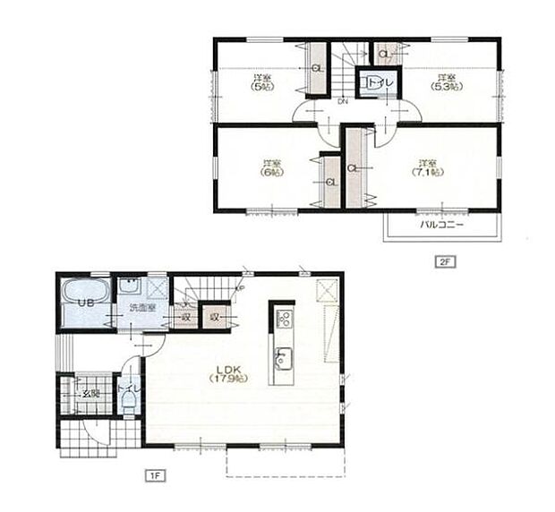| 間取り | 4LDK 間取り内訳:リビングダイニングキッチン 17.9帖(1階)・洋室 5帖(2階)・洋室 6帖(2階)・洋室 7.1帖(2階)・洋室 5.3帖(2階) |