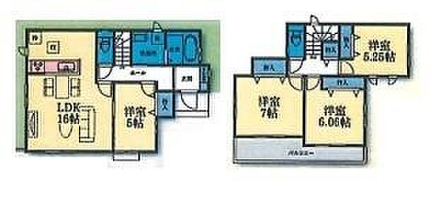 | 間取り | 4LDK 間取り内訳:リビングダイニングキッチン 16帖(1階)・洋室 5帖(1階)・洋室 5.2帖(2階)・洋室 7帖(2階)・洋室 6帖(2階) |