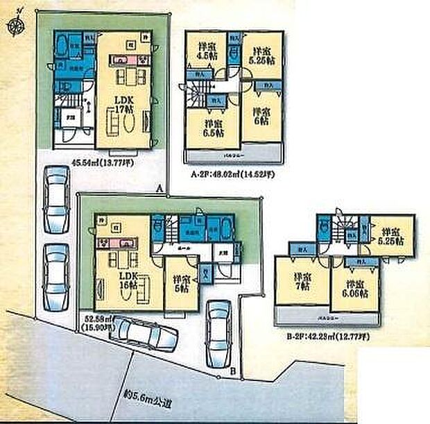 | 間取り | 4LDK 間取り内訳:リビングダイニングキッチン 16帖(1階)・洋室 5帖(1階)・洋室 5.2帖(2階)・洋室 7帖(2階)・洋室 6帖(2階) |