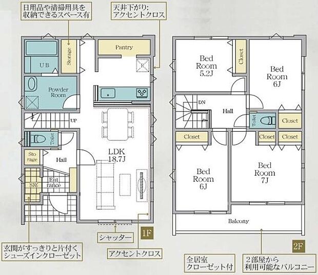 | 間取り | 4LDK 間取り内訳:リビングダイニングキッチン 18.7帖(1階)・洋室 7帖(2階)・洋室 6帖(2階)・洋室 6帖(2階)・洋室 5.2帖(2階) |