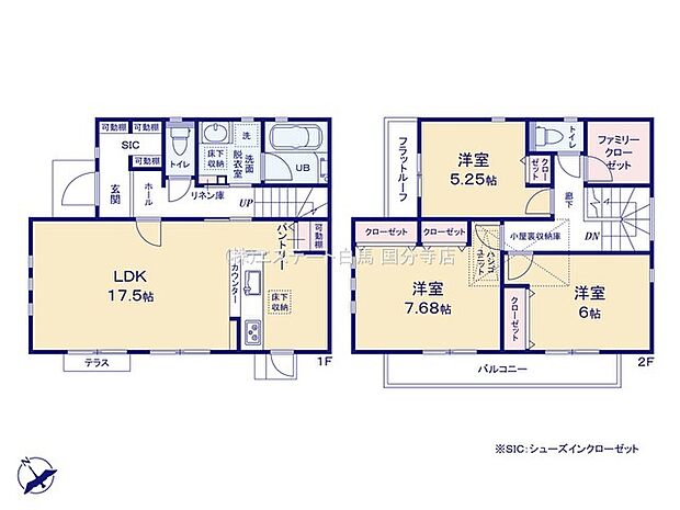 LDK17.5帖、水廻り集中、食洗機付。パントリー、SIC、WICあり。駐車2台可(車種による)。コンビニまで徒歩3分。
