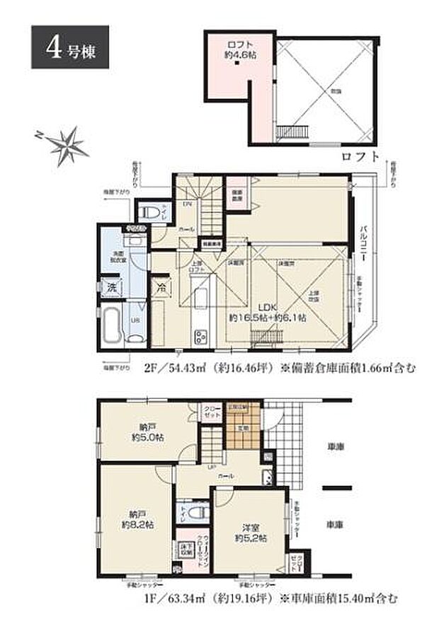 | 間取り | 1SLDK 間取り内訳:洋室 8.2帖(1階)・洋室 5.2帖(1階)・収納 5帖(1階)・リビングダイニングキッチン 22.6帖(2階) |