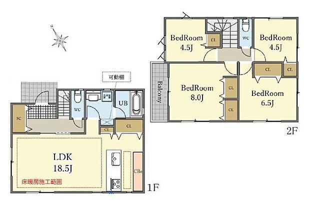 | 間取り | 4LDK 間取り内訳:リビングダイニングキッチン 18.5帖(1階)・洋室 4.5帖(2階)・洋室 8帖(2階)・洋室 6.5帖(2階)・洋室 4.5帖(2階) |