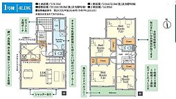 | 間取り | 3SLDK 間取り内訳:リビングダイニングキッチン 16.8帖(1階)・収納 6帖(1階)・洋室 6帖(2階)・洋室 7.5帖(2階)・洋室 6.1帖(2階) |