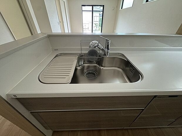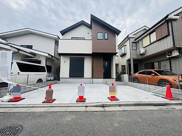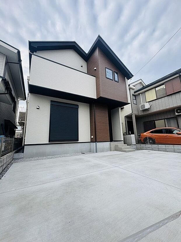 リビング上部に吹抜けを配置した、カウンターキッチンとリビング階段のある開放的な空間設計、公道に面した整形地、カースペース並列2台可能。