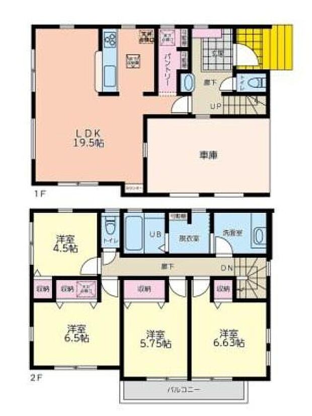 | 間取り | 4LDK 間取り内訳:リビングダイニングキッチン 19.5帖(1階)・洋室 6.6帖(2階)・洋室 6.5帖(2階)・洋室 5.7帖(2階)・洋室 4.5帖(2階) |